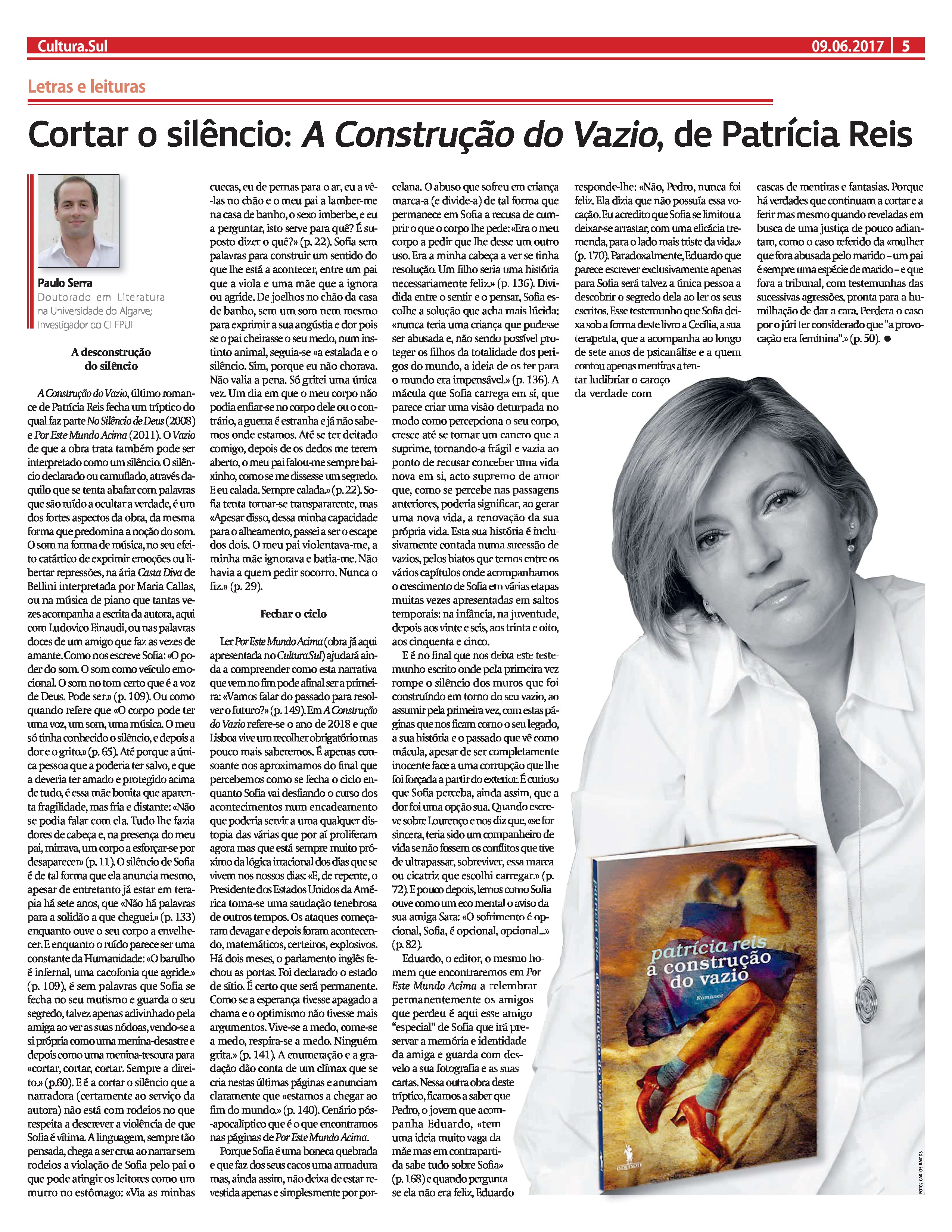 A Construção do Vazio, último romance de Patrícia Reis fecha um tríptico do qual faz parte No Silêncio de Deus (2008) e Por Este Mundo Acima (2011), todos publicados pela Dom Quixote. O Vazio de que a obra trata também pode ser interpretado como um silêncio. O silêncio declarado ou camuflado, através daquilo que se tenta abafar com palavras que são ruído a ocultar a verdade, é um dos fortes aspectos da obra, da mesma forma que predomina a noção do som. O som na forma de música, no seu efeito catártico de exprimir emoções ou libertar repressões, na ária Casta Diva de Bellini interpretada por Maria Callas, ou na música de piano que tantas vezes acompanha a escrita da autora, aqui com Ludovico Einaudi, ou nas palavras doces de um amigo que faz as vezes de amante. Como nos escreve Sofia: «O poder do som. O som como veículo emocional. O som no tom certo que é a voz de Deus. Pode ser.» (p. 109). Ou como quando refere que «O corpo pode ter uma voz, um som, uma música. O meu só tinha conhecido o silêncio, e depois a dor e o grito.» (p. 65). Até porque a única pessoa que a poderia ter salvo, e que a deveria ter amado e protegido acima de tudo, é essa mãe bonita que aparenta fragilidade, mas fria e distante: «Não se podia falar com ela. Tudo lhe fazia dores de cabeça e, na presença do meu pai, mirrava, um corpo a esforçar-se por desaparecer» (p. 11). O silêncio de Sofia é de tal forma que ela anuncia mesmo, apesar de entretanto já estar em terapia há sete anos, que «Não há palavras para a solidão a que cheguei.» (p. 133) enquanto ouve o seu corpo a envelhecer. E enquanto o ruído parece ser uma constante da Humanidade: «O barulho é infernal, uma cacofonia que agride.» (p. 109), é sem palavras que Sofia se fecha no seu mutismo e guarda o seu segredo, talvez apenas adivinhado pela amiga ao ver as suas nódoas, vendo-se a si própria como uma menina-desastre e depois como uma menina-tesoura para «cortar, cortar, cortar. Sempre a direito.» (p.60). E é a cortar o silêncio que a narradora (certamente ao serviço da autora) não está com rodeios no que respeita a descrever a violência de que Sofia é vítima. A linguagem, sempre tão pensada, chega a ser crua ao narrar sem rodeios a violação de Sofia pelo pai o que pode atingir os leitores como um murro no estômago: «Via as minhas cuecas, eu de pernas para o ar, eu a vê-las no chão e o meu pai a lamber-me na casa de banho, o sexo imberbe, e eu a perguntar, isto serve para quê? É suposto dizer o quê?» (p. 22). Sofia sem palavras para construir um sentido do que lhe está acontecer, entre um pai que a viola e uma mãe que a ignora ou agride. De joelhos no chão da casa de banho, sem um som nem mesmo para exprimir a sua angústia e dor pois se o pai cheirasse o seu medo, num instinto animal, seguia-se «a estalada e o silêncio. Sim, porque eu não chorava. Não valia a pena. Só gritei uma única vez. Um dia em que o meu corpo não podia enfiar-se no corpo dele ou o contrário, a guerra é estranha e já não sabemos onde estamos. Até se ter deitado comigo, depois de os dedos me terem aberto, o meu pai falou-me sempre baixinho, como se me dissesse um segredo. E eu calada. Sempre calada.» (p. 22). Sofia tenta tornar-se transpararente, mas «Apesar disso, dessa minha capacidade para o alheamento, passei a ser o escape dos dois. O meu pai violentava-me, a minha mãe ignorava e batia-me. Não havia a quem pedir socorro. Nunca o fiz.» (p. 29).