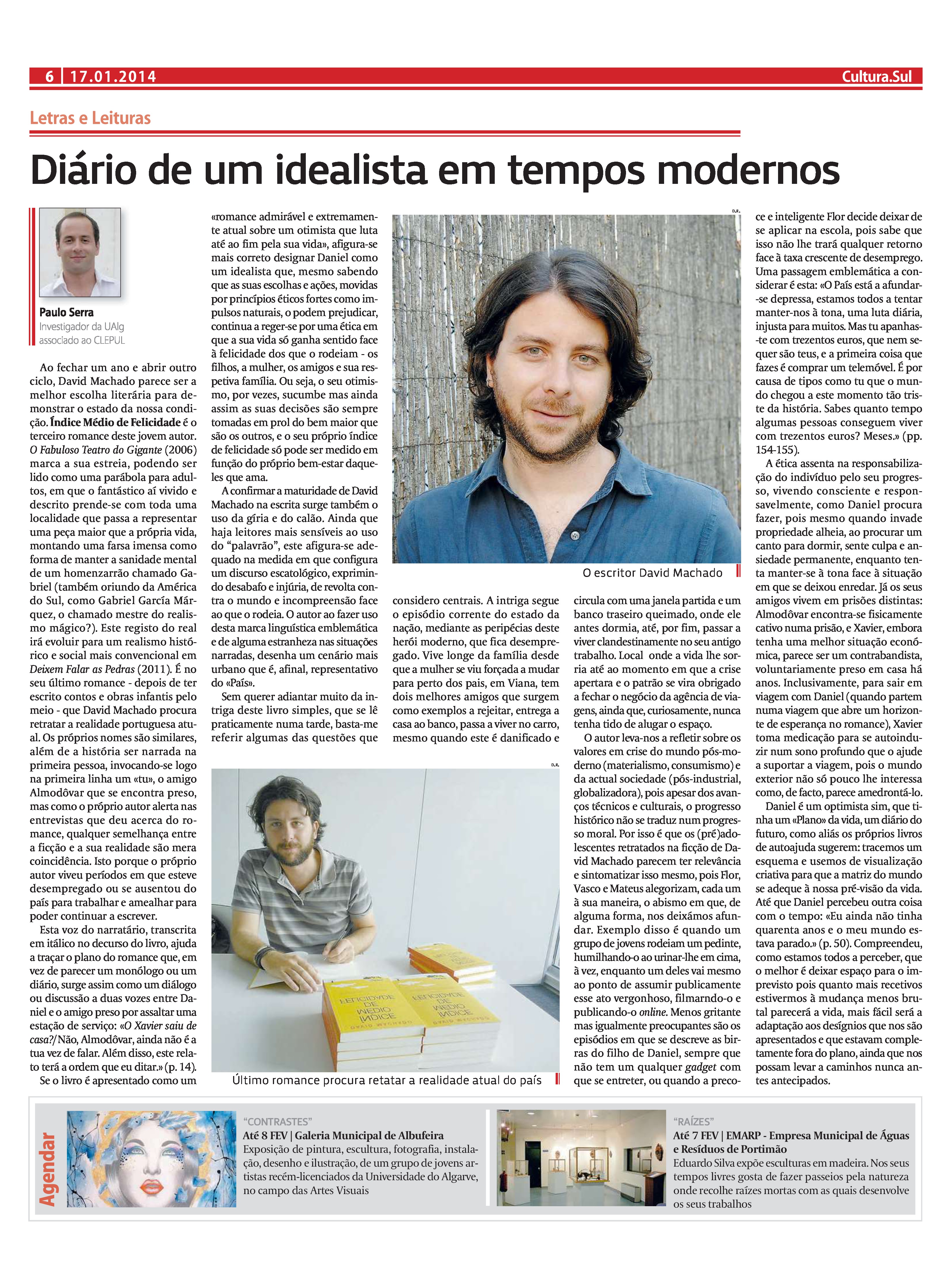 Ao fechar um ano e abrir outro ciclo, David Machado parece ser a melhor escolha literária para demonstrar o estado da nossa condição. Índice Médio de Felicidade é o terceiro romance deste jovem autor. O Fabuloso Teatro do Gigante (2006) marca a sua estreia, podendo ser lido como uma parábola para adultos, em que o fantástico aí vivido e descrito prende-se com toda uma localidade que passa a representar uma peça maior que a própria vida, montando uma farsa imensa como forma de manter a sanidade mental de um homenzarrão chamado Gabriel (também oriundo da América do Sul, como Gabriel García Márquez, o chamado mestre do realismo mágico?). Este registo do real irá evoluir para um realismo histórico e social mais convencional em Deixem Falar as Pedras (2011). É no seu último romance – depois de ter escrito contos e obras infantis pelo meio – que David Machado procura retratar a realidade portuguesa atual. Os próprios nomes são similares, além de a história ser narrada na primeira pessoa, invocando-se logo na primeira linha um «tu», o amigo Almodôvar que se encontra preso, mas como o próprio autor alerta nas entrevistas que deu acerca do romance, qualquer semelhança entre a ficção e a sua realidade são mera coincidência. Isto porque o próprio autor viveu períodos em que esteve desempregado ou se ausentou do país para trabalhar e amealhar para poder continuar a escrever.