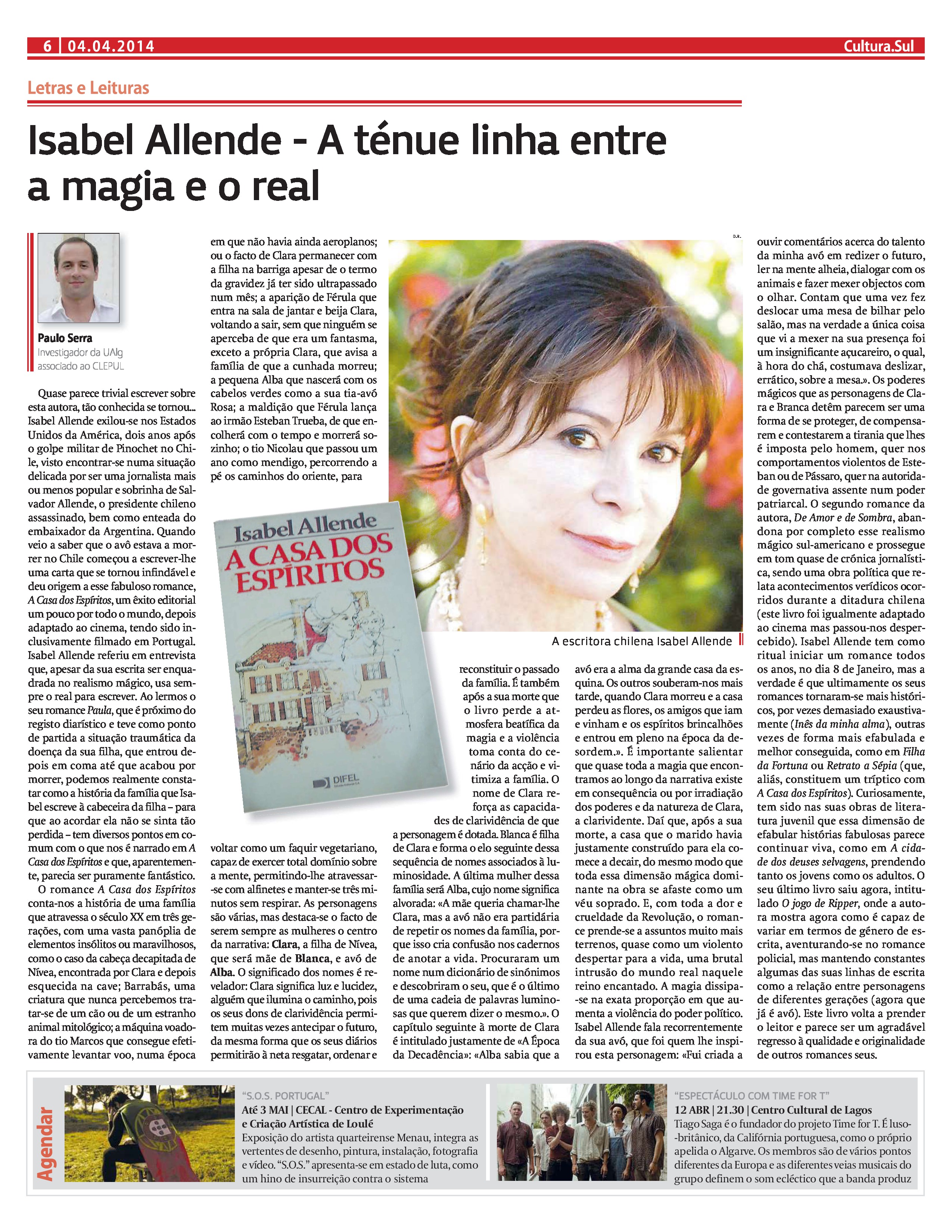 Quase parece trivial escrever sobre esta autora, tão conhecida se tornou… Isabel Allende exilou-se nos Estados Unidos da América, dois anos após o golpe militar de Pinochet no Chile, visto encontrar-se numa situação delicada por ser uma jornalista mais ou menos popular e sobrinha de Salvador Allende, o presidente chileno assassinado, bem como enteada do embaixador da Argentina. Quando veio a saber que o avô estava a morrer no Chile começou a escrever-lhe uma carta que se tornou infindável e deu origem a esse fabuloso romance, A Casa dos Espíritos, um êxito editorial um pouco por todo o mundo, depois adaptado ao cinema, tendo sido inclusivamente filmado em Portugal. Isabel Allende referiu em entrevista que, apesar da sua escrita ser enquadrada no realismo mágico, usa sempre o real para escrever. Ao lermos o seu romance Paula, que é próximo do registo diarístico e teve como ponto de partida a situação traumática da doença da sua filha, que entrou depois em coma até que acabou por morrer, podemos realmente constatar como a história da família que Isabel escreve à cabeceira da filha – para que ao acordar ela não se sinta tão perdida – tem diversos pontos em comum com o que nos é narrado em A Casa dos Espíritos e que, aparentemente, parecia ser puramente fantástico.