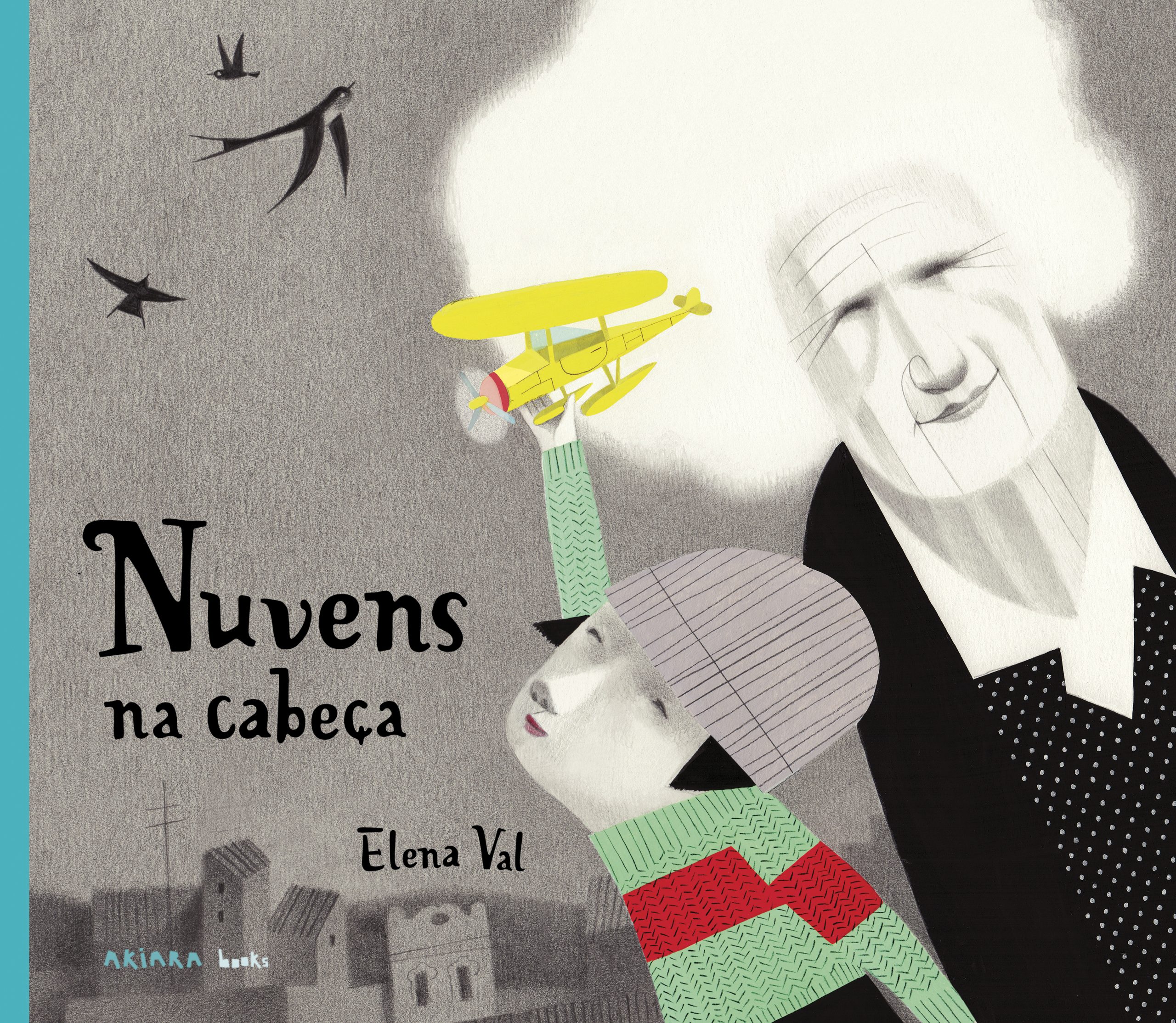 Nuvens na Cabeça, de Elena Val, é um livro poético, onde o jogo de palavras começa logo com as nuvens e os pássaros na cabeça (diz-nos a autora que desenha «também com palavras»), pois enquanto esta menina tem uma imaginação muito fértil – e um leão como amigo imaginário –, a avó vive no seu próprio mundo de fantasia, conforme a sua saúde mental se esvanece como uma nuvem no céu. Este «álbum ilustrado» permite-nos assim abordar temas delicados, como a demência ou o Alzheimer na terceira idade, com crianças de tenra idade, pois a autora dá-nos também a ver o mundo com olhos de criança:
