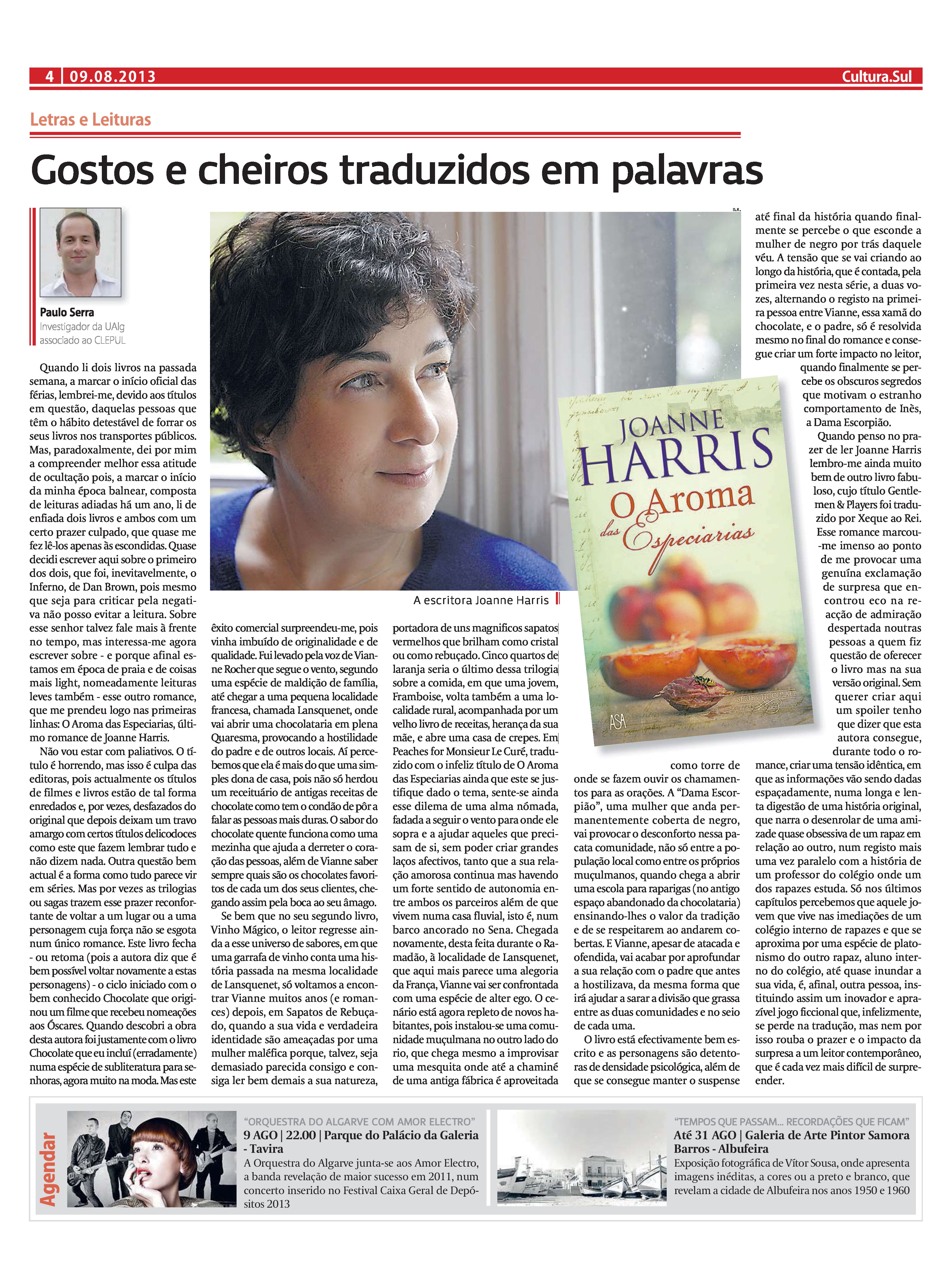 Quando li dois livros na passada semana, a marcar o início oficial das férias, lembrei-me, devido aos titulos em questão, daquelas pessoas que têm o hábito detestável de forrar os seus livros nos transportes públicos. Mas, paradoxalmente, dei por mim a compreender melhor essa atitude de ocultação pois, a marcar o início da minha época balnear, composta de leituras adiadas há um ano, li de enfiada dois livros e ambos com um certo prazer culpado, que quase me fez lê-los apenas às escondidas. Quase decidi escrever aqui sobre o primeiro dos dois, que foi, inevitavelmente, o Inferno, de Dan Brown, pois mesmo que seja para criticar pela negativa não posso evitar a leitura. Sobre esse senhor talvez fale mais à frente no tempo, mas interessa-me agora escrever sobre – e porque afinal estamos em época de praia e de coisas mais light, nomeadamente leituras leves também – esse outro romance, que me prendeu logo nas primeiras linhas: O Aroma das Especiarias, último romance de Joanne Harris.